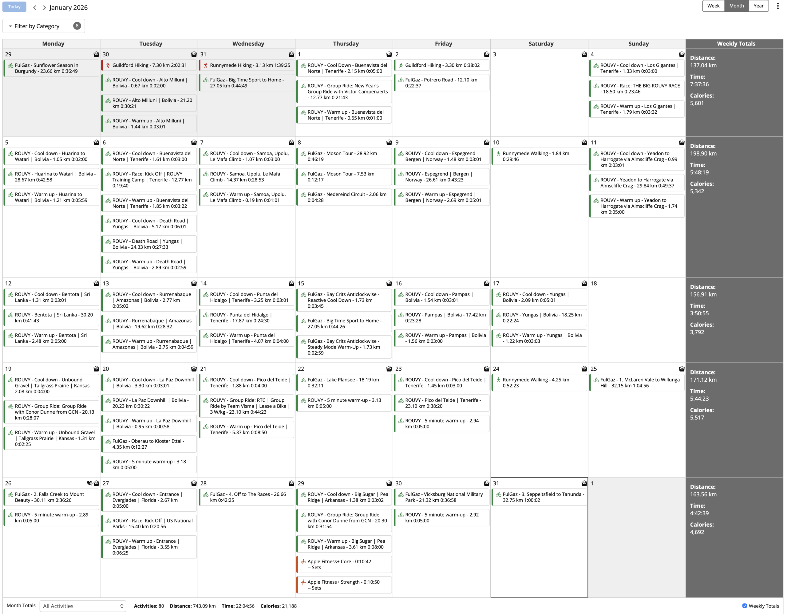Activities: 80 Distance: 743.09 km Time: 22:04:56 Calories: 21,188